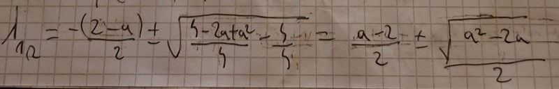 Aa ok jag förstår. Men räcker det med att bara ett av egenvärden har realdel 0 eller måste båda vara det? Vi har ju detta lösning nedan och uttrycket under rottecknet måste isåfall vara <=0 vilket sker då 0<=a<=2 och om realdelen ska vara 0 så måste isåfall a=2