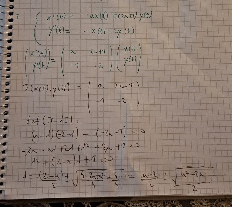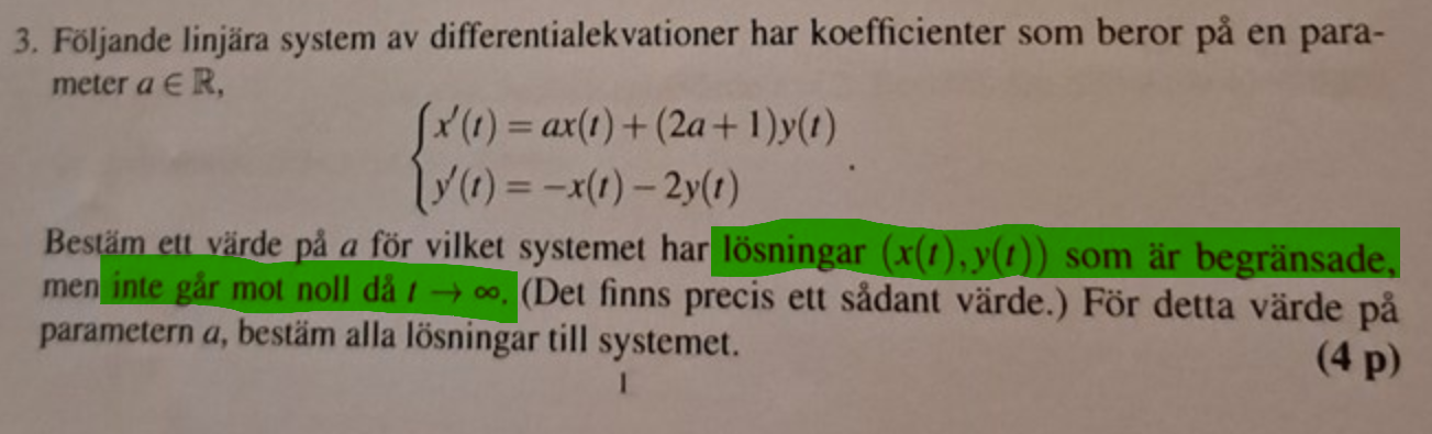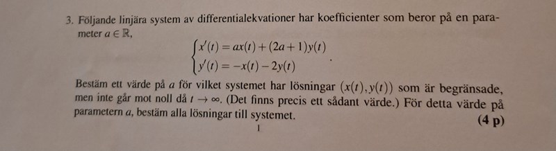 Jag började med att hitta egenvärden för att bestämma lösningar till linjära system, men hur ska man hitta det här parameter a ? Jag tänker om systemet ska ha lösningar som är begränsad och ej går mot 0 , måste de anges med sin och cos vilket enbart kan ske om rottecknet <=0. Men lösningarna ska väl ha en realdel och en imaginär del.