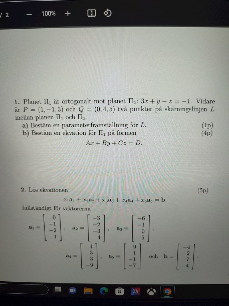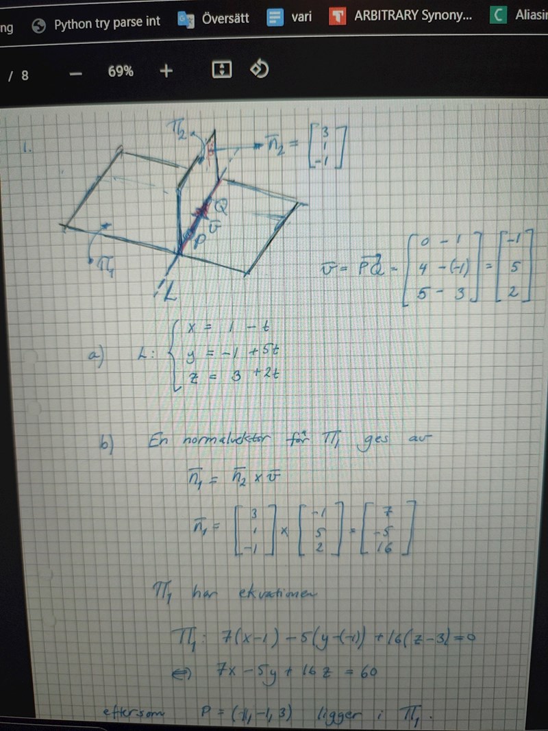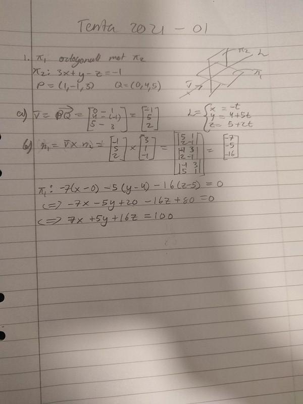Hej! Jag gör en gammal tenta och har mer eller mindre gjort som facit på första frågan (1 a & b) jag tog dock riktnings vektorn × normalvektorn (V×n2) istället för (n2×v) <-- så gjorde de i facit, för att få fram normalvektorn till till π1. Spelar det alltså roll? Ska man alltid ta normalvektorn × riktningsvektorn?