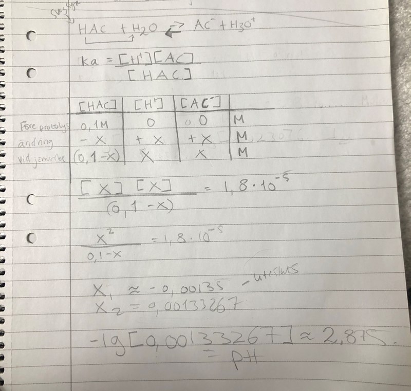 I en labb ska vi blanda 15 ml 0,1 M HAc med 50ml vatten och pH-värdet ska bestämmas.