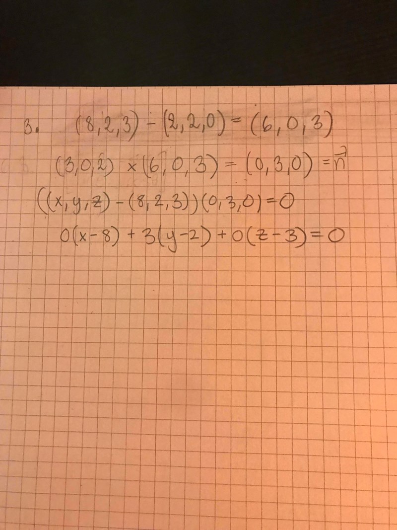 Laguna skrev:Jag skulle ta kryssprodukten mellan (8,2,3)-(2,2,0) och (3,0,2) för att få en normalvektor till planet.