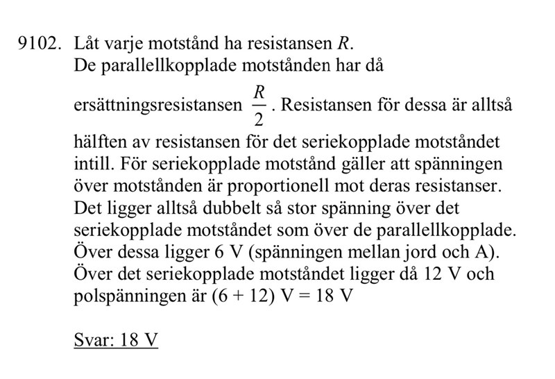 Du har ju en lösning. Men jag skulle kanske ha resonerat med strömmar istället: eftersom strömmen genom det ensamma motståndet är dubbelt så stor som genom de två parallellkopplade är spänningsfallet också dubbelt så stort: 12 volt. Det ger förstås samma svar.