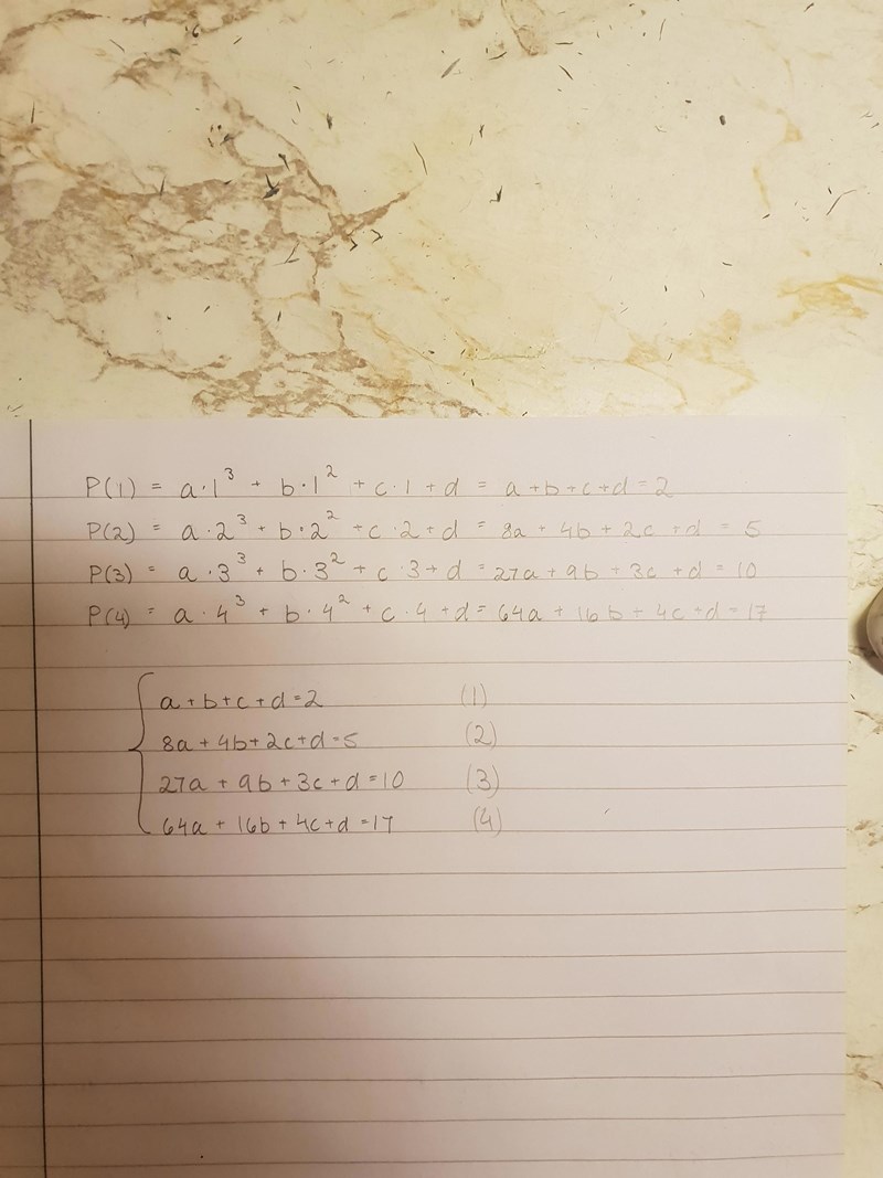 A, b, c & d motsvarar de 2, 5, 10 & 17? Blir då formeln p(x) = 2x^3 + 5x^2 + 10x + 17, eller ska jag välja en av x och sätta in den också?