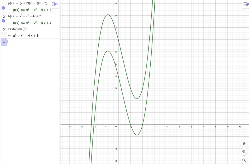 Jag förstår.. eye-opener. Tror aldrig att jag tänkt på det viset men drar mig till minnes den gången man höjde och sänkte reglaget till konstanten av en andragradare i ma2c och då hände ju inte så mycket förutom att den gick upp och ned så det är väl samma princip här. Som jag förstår det så går detta bara att göra i funktionens utvecklade form? För när jag försöker faktorisera h(x) så händer inte så mycket.. (se bif.)