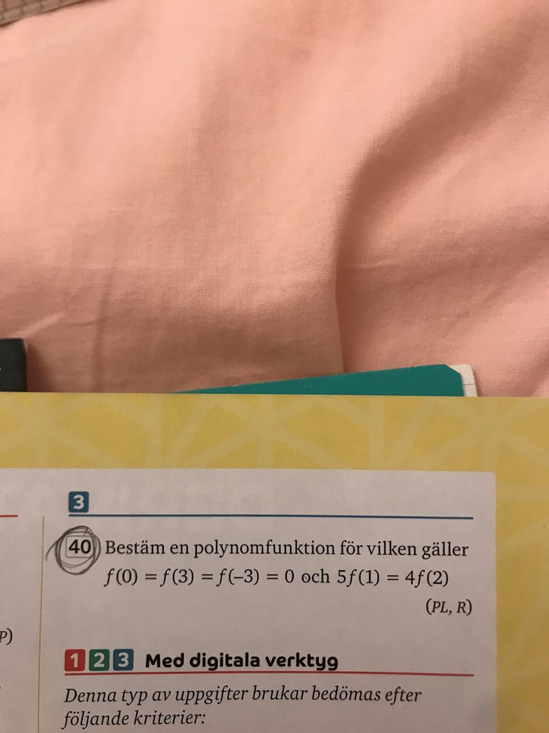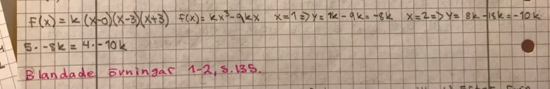 Vad skall svaret bli? "f(x)=x(x^2-9)p(x) där p(x) är ett polynom med p(1)=p(2)"?