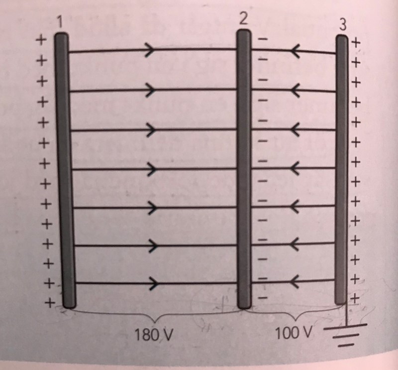 Ahaaaaa okej, då förstår jag varför platta 2 får potentialen -100 V. Platta 1 kommer då få 0 V - 100 V + 180 V = 80 V ?