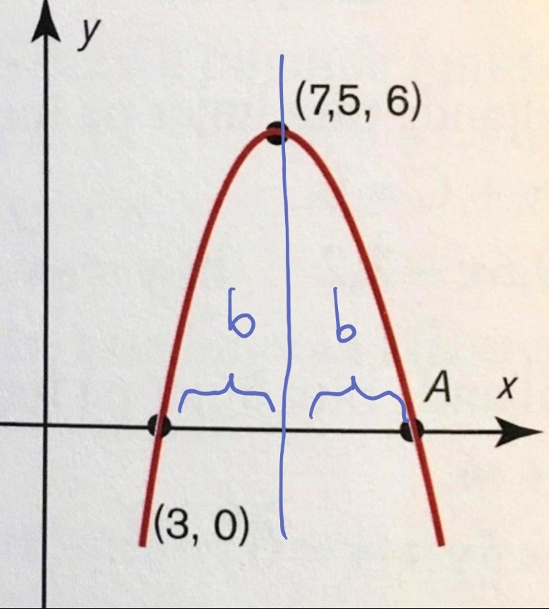 Man kan säga så här : skillnaden mellan 7,5-3=4,5 . Det är avståndet från punkt (3,0) till ”symmetrilinjen” (halva sträckan/ vet ej hur jag ska beskriva det”... Men om sträckan är 4,5 åt vänster så är det 4,5 åt höger alltså 9 + 3=12.