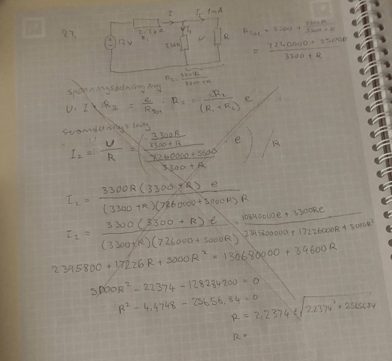 Jag har försökt ställa upp ekvationssystem med strömdelnings- och spänningsdelningslagarna men får vid varje försök en andragradsekvation som innehåller mycket stora värden och som ger fel lösning på R. Hur borde jag lösa denna uppgift istället?
