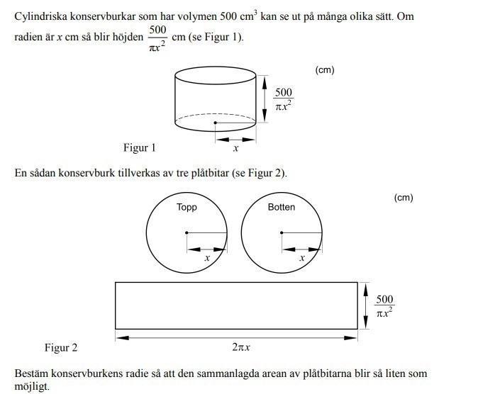 Jag tänker att jag skriver ett uttryck för den totala arean för att sedan derivera uttrycket och sätta det = 0