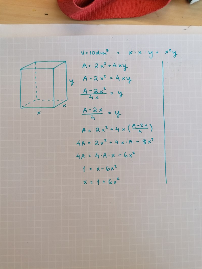 Det står i uppgiften att rätblocket skall ha en kvadratisk basyta. Kalla basytans sida för x (dm). Kalla rätblockets höjd för h (dm). Hur stor är rätblockets totala begränsningsyta A (dm2)? Det är denna area som skall bli så liten som möjligt. Problemet är "bara" att du har två olika variabler, x och h.