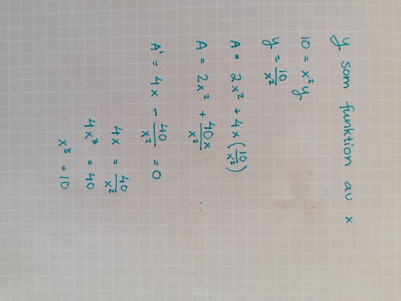 Men du vet ju att rätblockets volym skall vara 10 dm3!  Detta gör att du kan få fram ett samband mellan h och x, d v s du kan skriva h som en funktion av x. Sätt in detta värde i ditt uttryck för A, så får du en funktion som bara beror på sidlängden x. Derivera detta uttryck och sätt derivatan lika med 0.