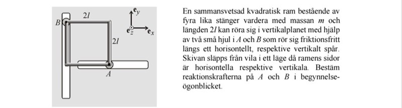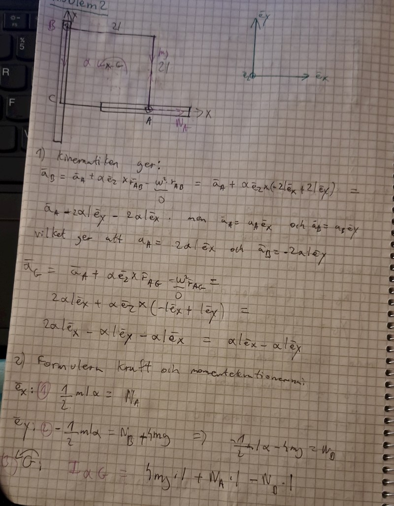 Jag är ganska osäker på min lösning då jag räknade ut accelerationen i B trots att i vissa uppgifter så kan man räkna accelerationen i A och I G men ej B (beror kanske på uppgiften). Dessutom glömde jag att sätta mg vid hörnen på de 4 stängerna. Min NA är ocksä felritad, den ska vara riktad åt höger i ex riktning.Så jag undrar om accelerationerna för denna uppgift stämmer? Stämmer det också att vi kommer få följande kraftekvationer nedan:
