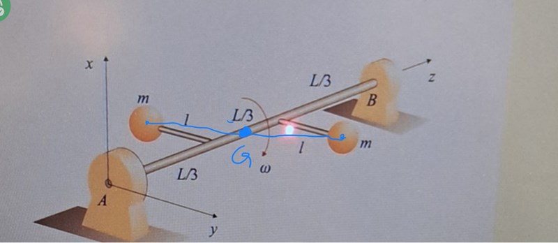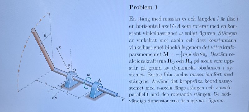 jag hänger tyvärr inte med och därför kan inte jag skissa en figur. Jag är med på att om något är stilla så har den varken hastighet eller acceleration, men jag förstår inte om du menar att stången är stilla eller om dessa masscentrum är stilla som i första problemet där stången roterar kring z-axeln dvs sin egen axel som den ligger på ? men är inte stången stilla även i det andra problemet trots att w roterar i z-axeln som är OA-axeln?
