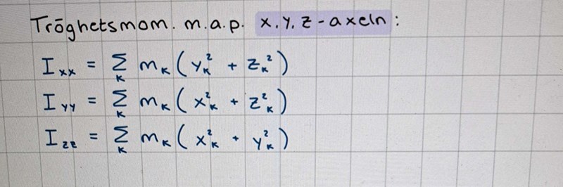 Ja precis. Men är det samma sak som att använda de här summorna då? Sen förstår jag inte varför I_gxx=0 ? Igxx för en homogen stång är väl ml2/12 . Jag tänkte mig IOxx=IGxx+m(yG2+zG2)
