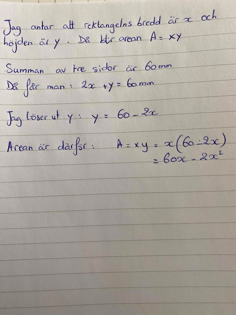 Så här ser ut mina tankar men jag undrar om maximala arean är samma som jag hittade eller jag måste derivera funktionen (jag menar 60x-2x2) och sen hittar jag maximi värdet eller räcker det med beräkningar ovan ?