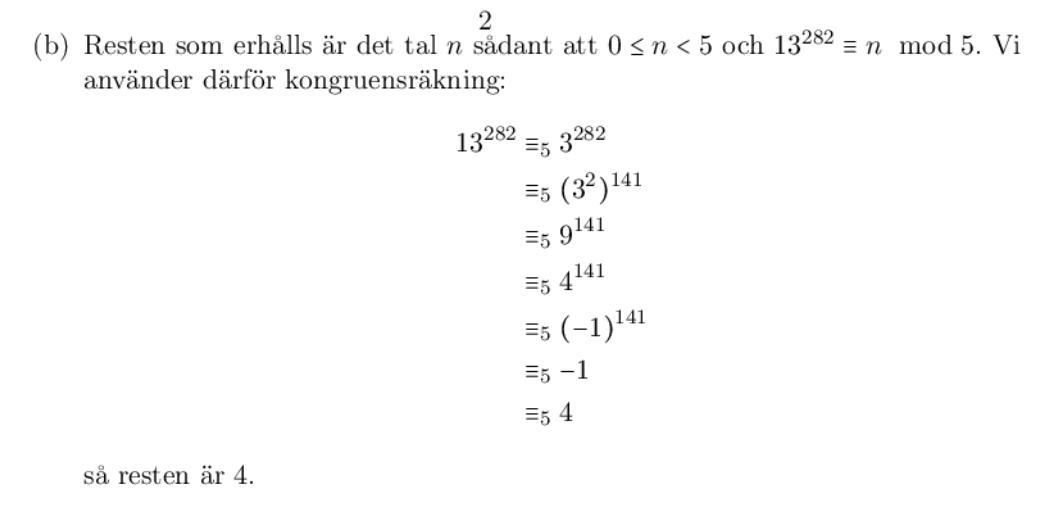 "Bestäm resten som fås då 13^282 delas med 5."