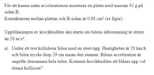 (5,56m/s)/11363,6s = 1,89m/s2 vilket är mindre än vad a måste vara därför är svaret på a) nej, men det är fel svar, vad har jag gjort för fel