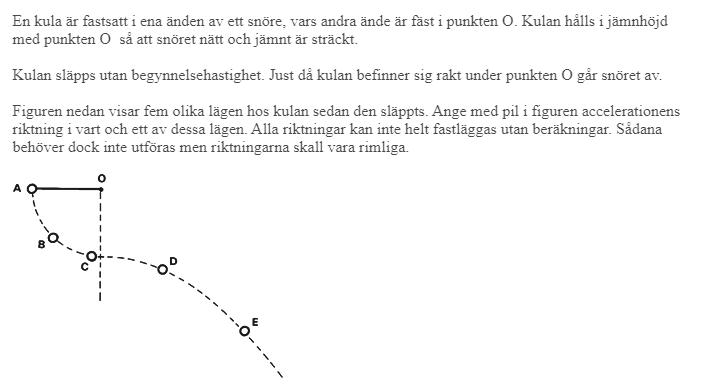 Fundera på varför kulan beskriver en cirkelbåge och vad det innebär i form av krafter på kulan? (F=ma)