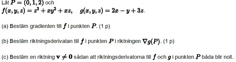 b)Jag vet för att få riktningsderivatan behöver vi ta skalärprodukten med en enhetvektor i den givna riktningen. Jag vet hut man gör mellan två punkter med vet inte vad jag ska göra om jag har gradient för g(x,y,z), den ger mig normalen men sen då?