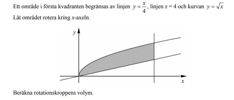 Laguna skrev:Det ni räknar ut är volymen om man skulle trycka ner figuren så att den vita triangeln vid x-axeln försvann. Som Mohammad säger ska man räkna ut rotationsvolymerna för de två kurvorna var för sig och sedan subtrahera.