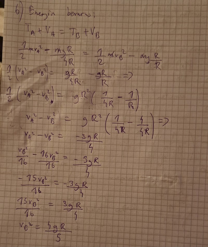 Jag började ungefär såhär men jag vet inte hur man ska få in det här faktorn och allmänt hur man går vidare efter energibevarande när man fått ett uttrycket för hastigheten i B. Jag antar att vårt v0 är uttrycket gR/4?
