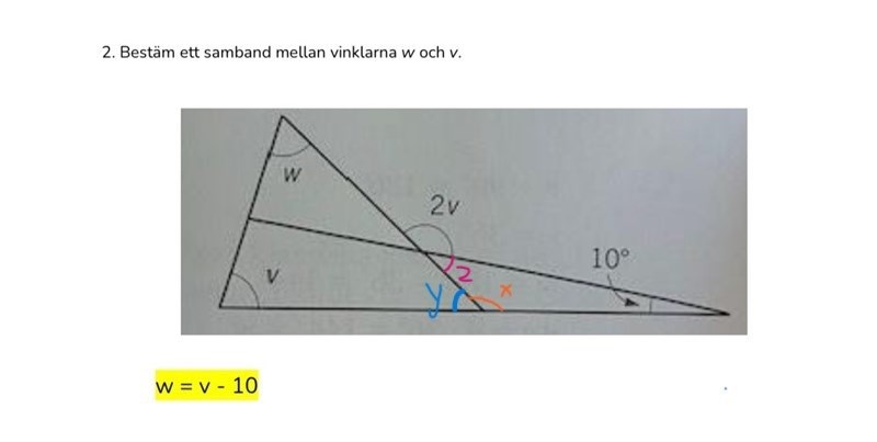 Såsom frågan lyder, hur bestämmer jag sambandet mellan vinklarna v och w? Svaret ska bli: w=v-10.