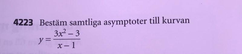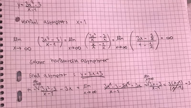 Hej, jag har följande uppgift att lösa vilket jag nästan gjort. I facit finns bara den sneda asymptoten men inte vertikala och jag förstår inte varför...
