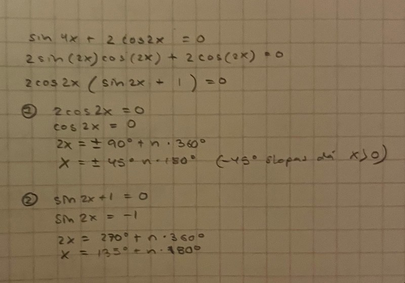 Jag håller på med denna uppgift som du kan se nedan. Jag kommer fram till x = 45° + n * 180° samt 135° + n * 360°. Jag förstår inte riktigt hur man kommer fram till de andra lösningarna och hade uppskattat hjälp!