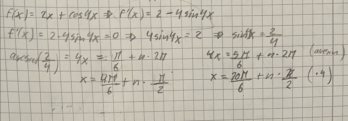 Bestäm samtliga lösningar till ekvationen f′(x)=0 i intervallet 0≤x≤π då f(x)=2x+cos4x