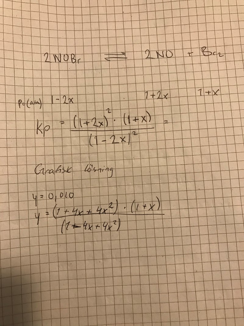 Jag förstår inte vad du menar med om reaktionen är kvantitativ och hur det är relevant. Jag vill få ut x för att beräkna skillnaden för trycket för det olika reaktanterna. Jag vill helst göra en grafisk lösning för att få ut x och på så vis beräkna partialtrycken med våra förhållanden. Men det saknas en konstant för NaBr. Jag kanske är ute och cyklar. jag Venne.
