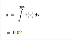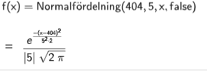 Sedan körde jag integralen där p(0 till 394) för att få reda på sannolikheten att det ej blir minst 395. Alltså fick jag