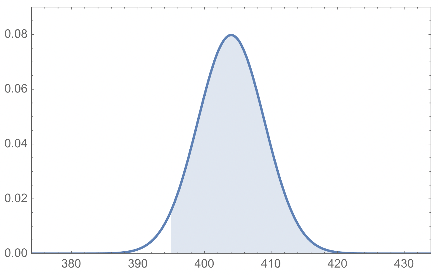 P[X≥395] = 1-P[X<395]=1-"din integral, men med 395 som övre integrationsgräns" = 0.96407