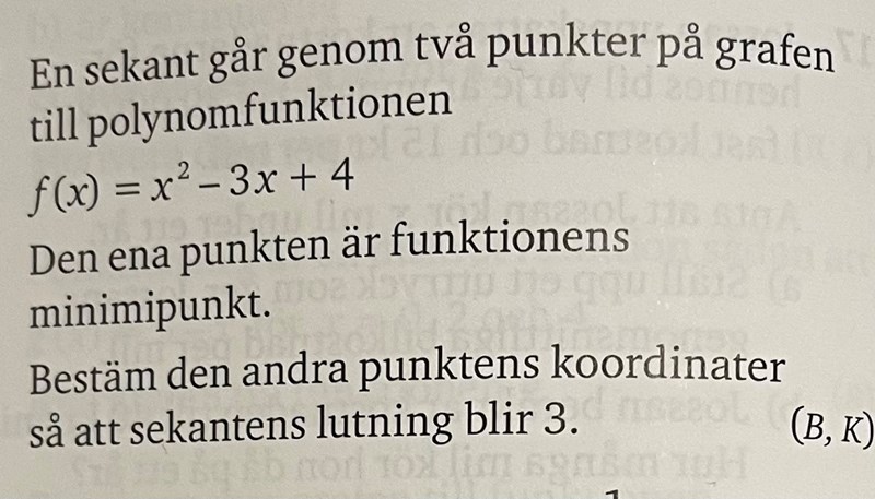 Minns du hur man beräknar lutningen hos en sekant? De har givit dig lutningen hos sekanten. Testa skriva upp formeln och se vad du behöver mer för att lösa uppgiften.