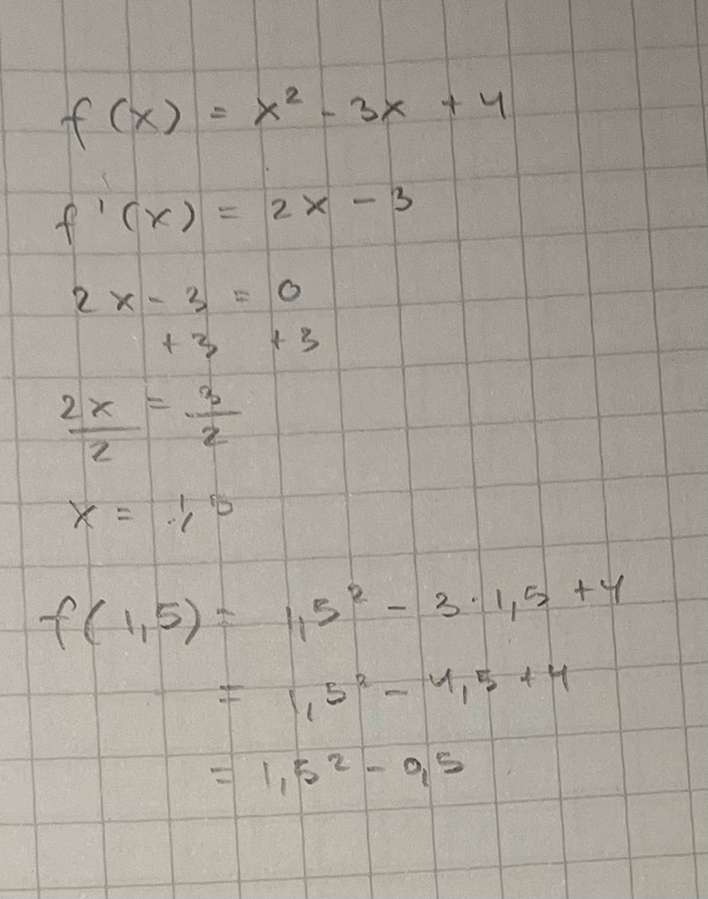 Jag håller på med denna uppgift som du kan se nedan. Jag har försökt ta reda på minimipunktens koordinater genom att derivera funktionen och sedan sätta = 0. Då fick jag fram att minimipunktens x-värde är 1,5. Sedan försökte jag få fram minimipunktens y-värde genom att sätta f(1,5). Men jag vet att jag har gjort fel men jag förstår bara inte vad. Hur ska jag gå vidare för att lösa uppgiften?