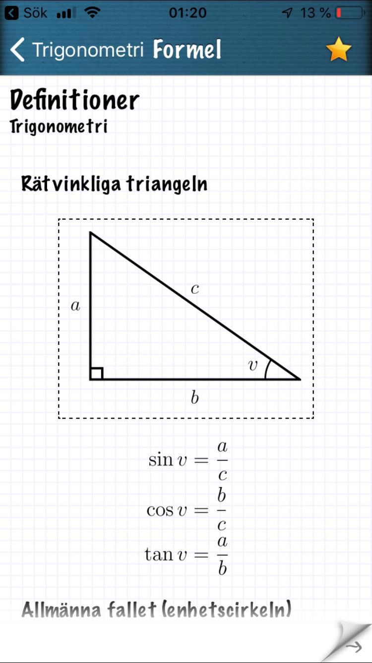 Man kan göra kvoter av sid-längderna på 6 olika sätt, och alla dessa kombinationer har egna namn, men det är bara tre av dm man använder till vardags. Kvoten motstående katet/hypotenusa kallas sinus för en viss vinkel, närliggande katet/hypotenusa kallas cosinus för vinkeln och närliggande katet/motstående katet kallas tangens för vinkeln. Det är bara att titta efter i formelbladet vilken som är vilken, och vara glad och tackeam för att man slipper att dessutom lära sig (definitionen av) sekant, cosekant och cotangens för alla vinklar.