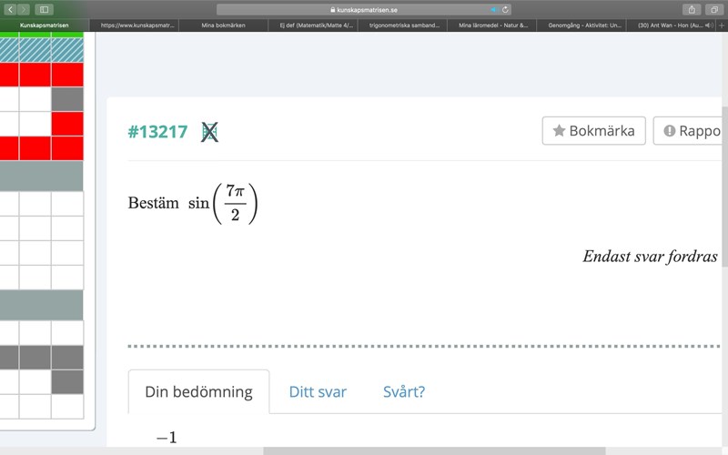 Gro65 skrev:Sinusfunktionen är periodisk och antar samma värde efter 2π (360°). Det betyder också att sin (7π/2) = sin (π/2). Det finns flera sätt att lösa funktionen på, men att lära dig enhetscirkeln kommer att underlätta att lösa även andra trigonometriska uppgifter. Enligt enhetscirkeln är sin (π/2) = -1. Dvs sin(7π/2)=sin(π/2)=-1.