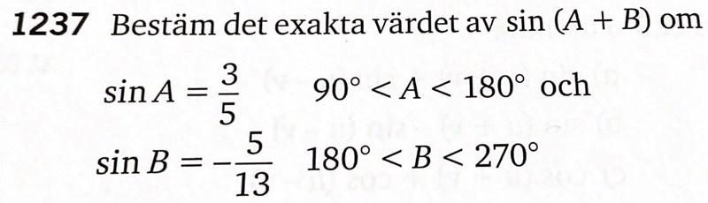Jag har räknat ut cos A och cos B med hjälp av trigonometriska ettan till och , men jag tror att jag gör det fel på något vis för jag får svaret till men facit säger att . Lite hjälp skulle sannerligen uppskattas.