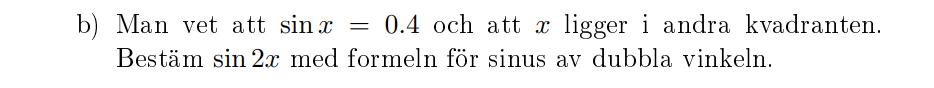 Bubo skrev:Alternativ lösning: Om v ligger i andra kvadranten, vilken/vilka kvadrant(er) ligger 2v i?