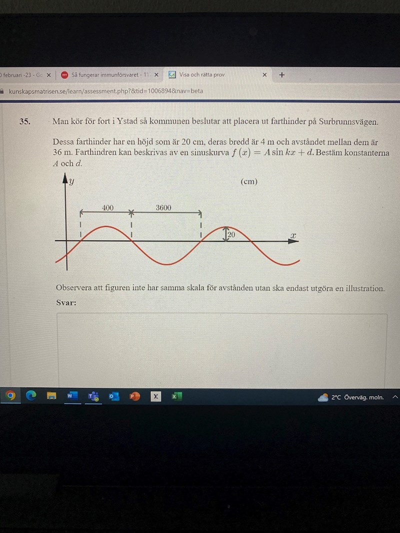 Hej! Jag skulle behöva hjälp med frågan som ni ser på bilden. Jag har kommit fram till k värdet och måste nu bestämma A och d värdena. Eftersom jag har två okända hade det varit bra om jag kunde sätta in två punkter från funktionen och utifrån det göra ett ekvationssystem. Jag tänker mig då kanske två av nollställena på funktionen. Problemet är att jag inte riktigt vet hur jag ska få fram nollställena! Tacksam för hjälp på vägen!
