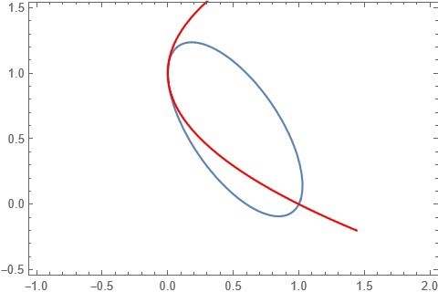 Här är en plottad bild på kurvan och skärningpunkterna. Facit anger att skärningsvinkeln för (0,1) är 0° och (1,0) är 90°