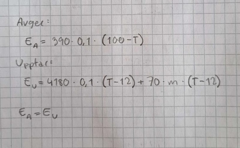 Jag ställde upp två uttryck för det som tar upp värme (vattnet och kalorimetern) och det som avger värme (kopparnubb) men jag fattar inte hur jag ska kunna räkna ut det utan massan av kalorimetern?
