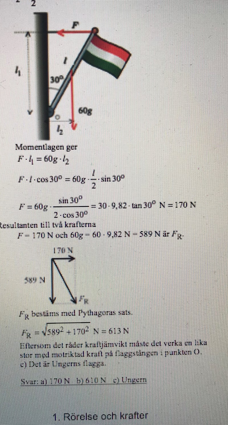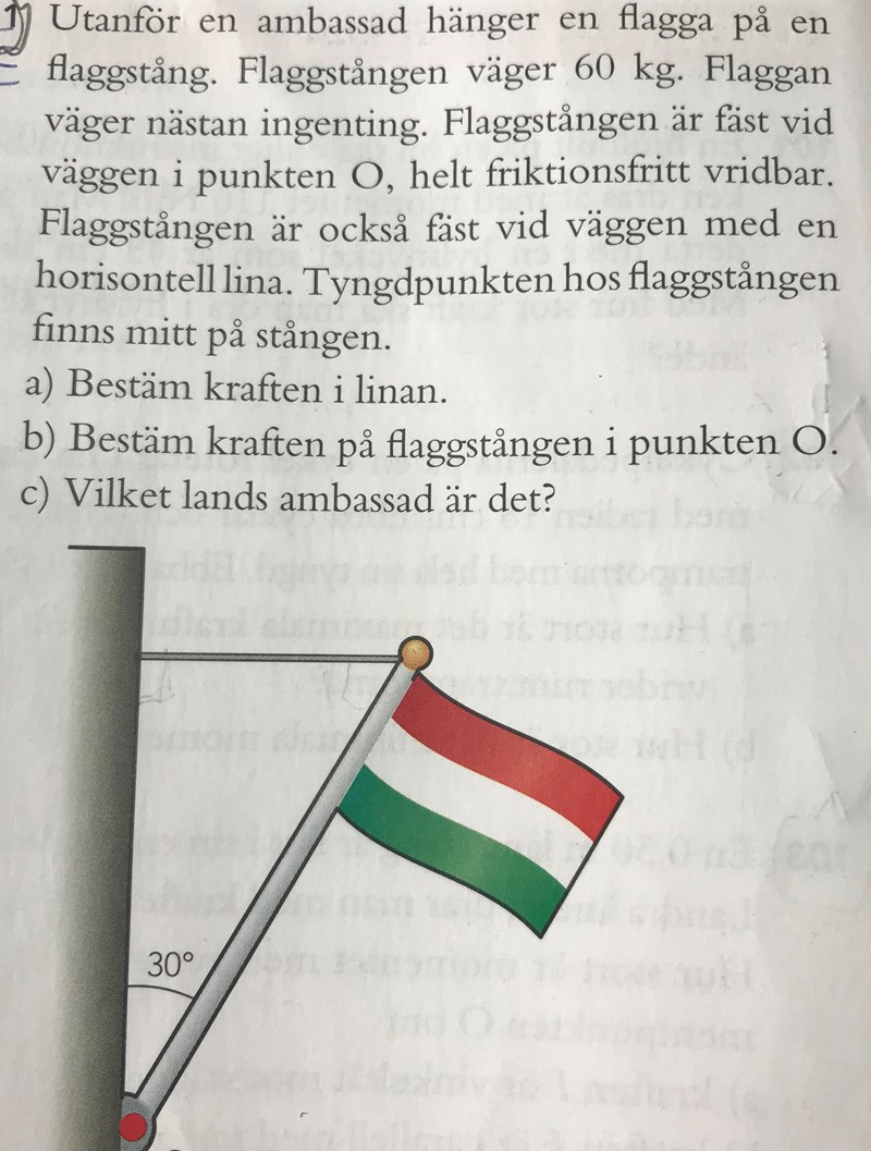 Frilägger du flaggstången och använder spännkraften i linan du beräknat med en momentjämvikt i a) får du