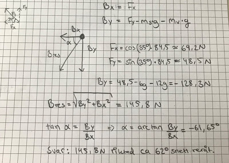 Så kraftmoment vid punkt B är M(m1)=F*d=58.92*sin35=33.795N