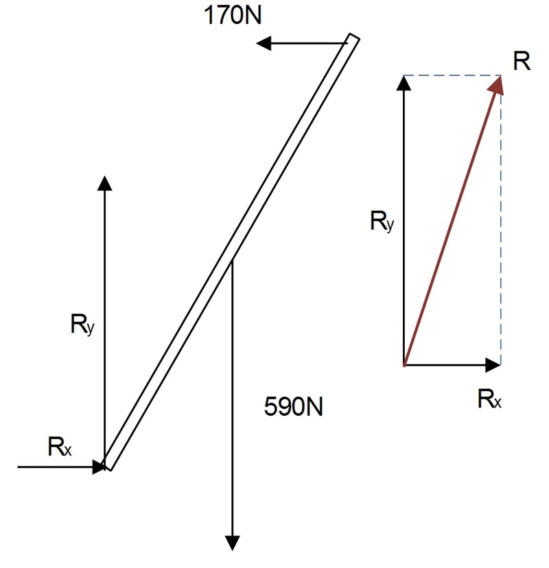 Stödkraften lutar ungefär 62° snett upp åt höger, dvs .
