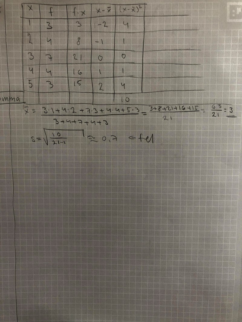 Smaragdalena skrev:Du måste räkna med frekvensen för varje utfall! Alltså 3.4+2.1+7.0+4.1+3.4 = 30 i täljaren.