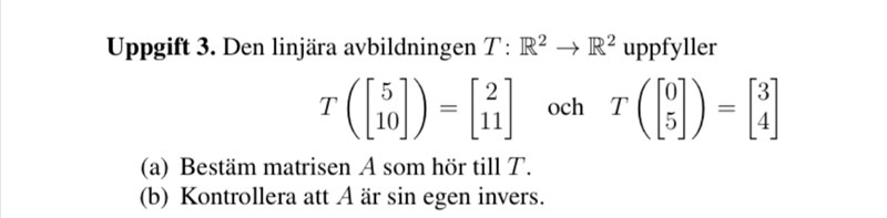 . Om du multiplicerar detta med en femtedel får du e1. Vi kan alltså hitta genom att beräkna . När du har linjära linjära transformationer (vilket T är) kan du då beräkna som , vars värden du redan har. T(e2) kan sedan beräknas på liknande sätt. :) Du slipper med andra ord Gausseliminera.