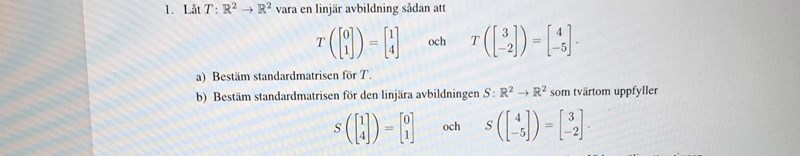 MrPotatohead skrev:Det finns två sätt. Antingen kollar du vad som händer med basvektorerna i avbildningen. Avbildningarna av dem är kolonnvektorerna i T. Eller så kombinerar du båda ekvationer till en matrisekvation och löser ut T.