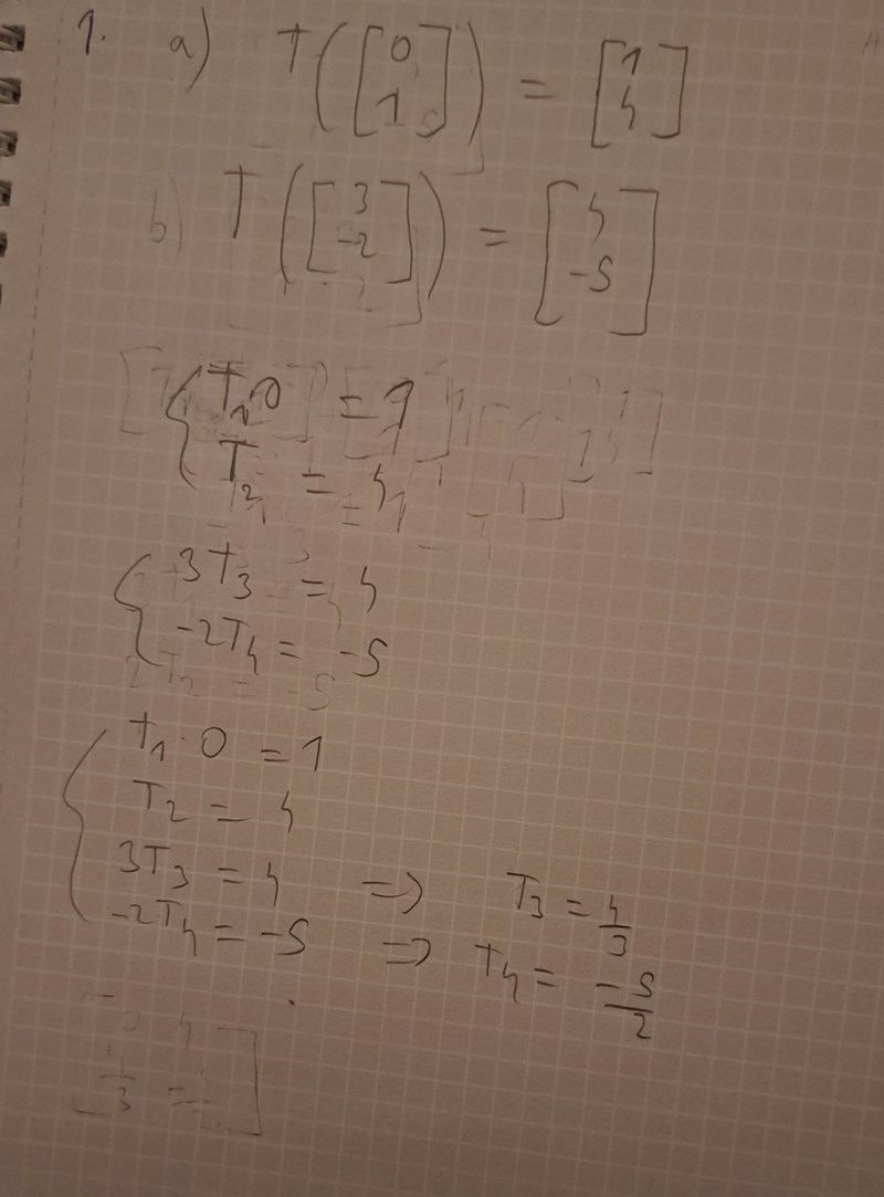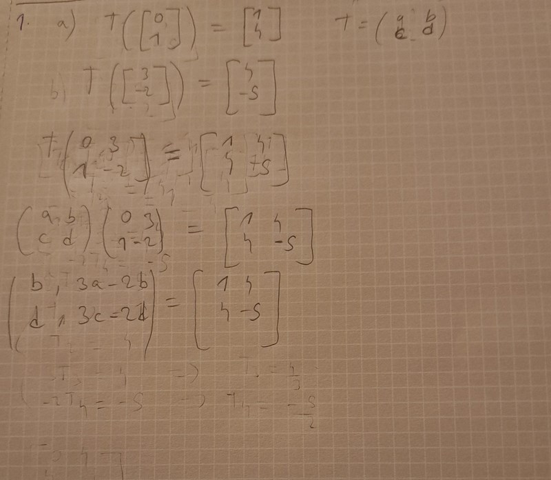 Det finns två sätt. Antingen kollar du vad som händer med basvektorerna i avbildningen. Avbildningarna av dem är kolonnvektorerna i T. Eller så kombinerar du båda ekvationer till en matrisekvation och löser ut T.