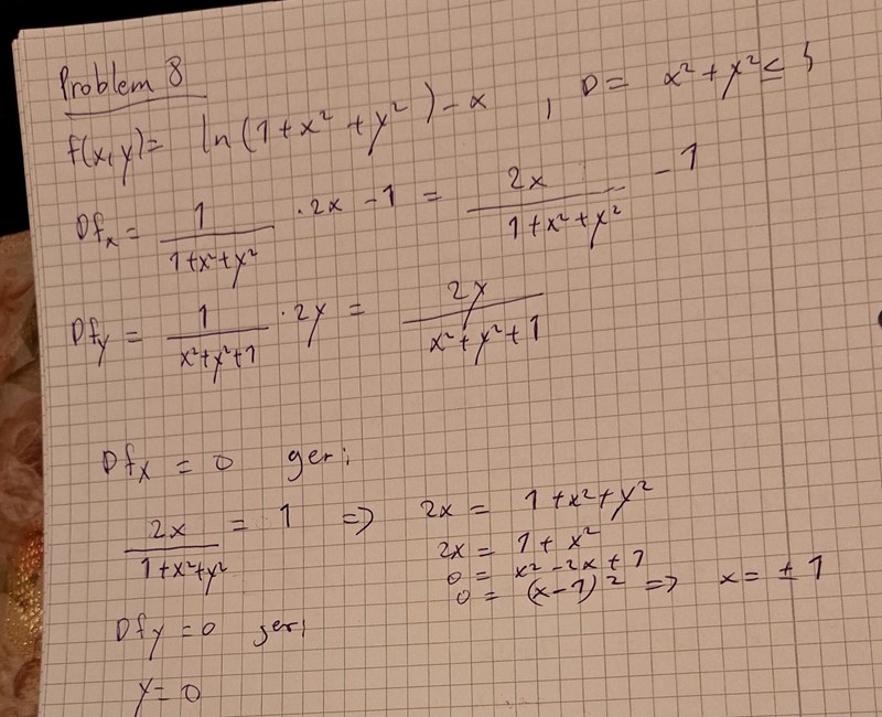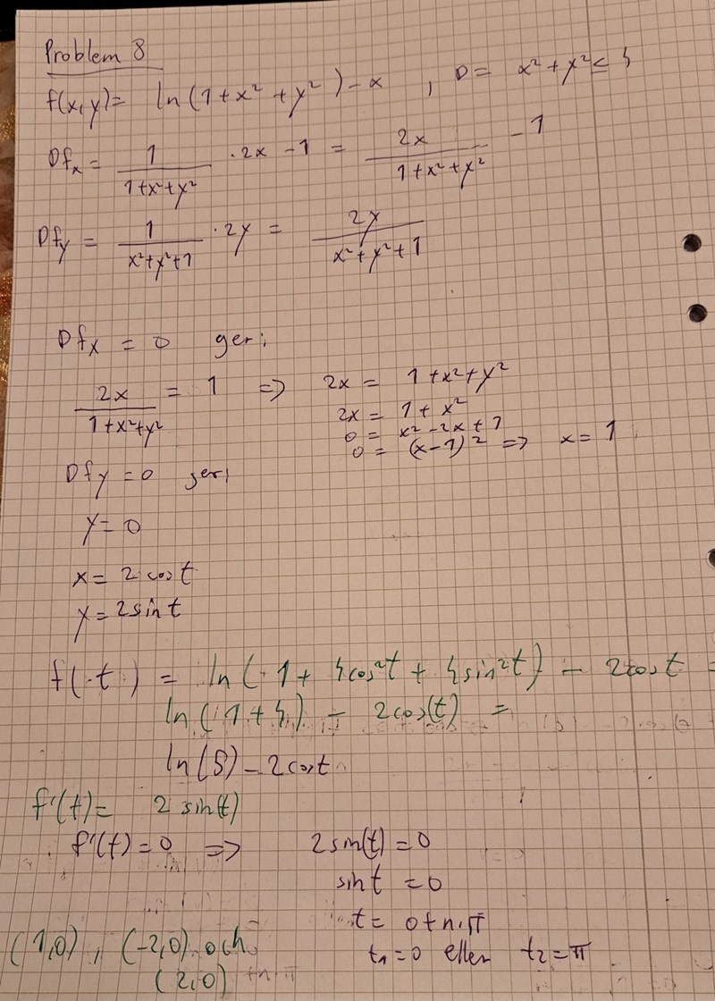 Jag bestämde var funktionen är noll för x och y led. Sen använde jag polära koordinater för att titta på cirkelskivan och då fick jag r=1 samt v=0. Nu är jag lite fast på hur jag ska hitta största och minsta värde. Våra kandidater justnu är (1,0) och (1/2,0)