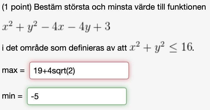 är en kandidat till max eller min. Cirkelskivans rand parameteriseras av och där och på randen söks max och min till funktionen